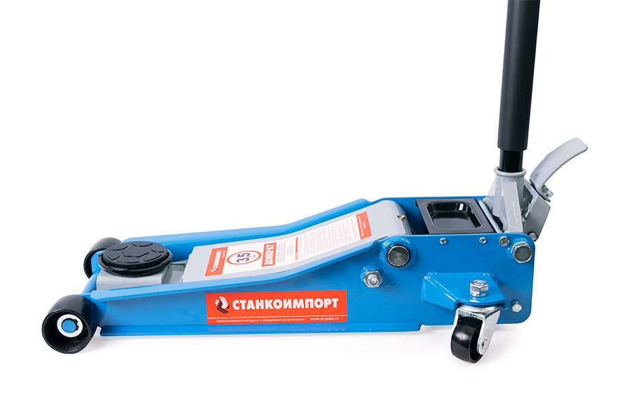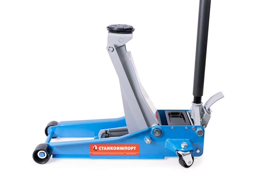 Подкатной гидравлический домкрат имеет ручной привод и предназначен для подъема машины при осуществлении ремонтных работ — к примеру, замены колес. Он отлично подойдет для личного использования на даче, в гараже или для работы на небольшой шиномонтажной станции.