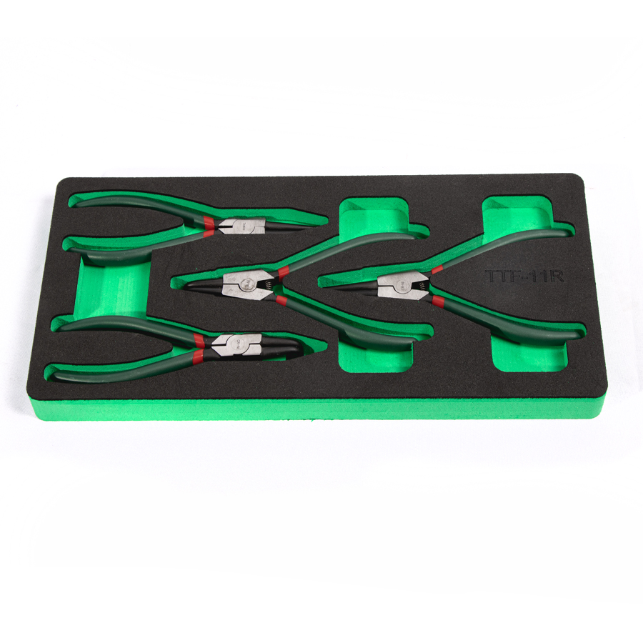 Съемники стопорных колец Hans помещены в удобный ложемент, который изготовлен из EVA (этилен винил ацетат) пены. Данный материал обладает высокой стойкостью к агрессивным средам и механическим воздействиям. Рабочая часть съемника имеет зональную закалку токами высокой частоты , что в свою обеспечивает высокие показатели прочности, надежности удержания стопорного кольца и долгий срок службы.