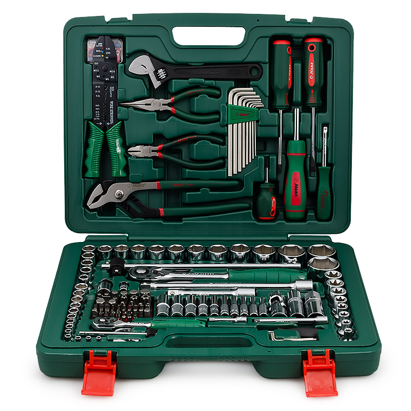 Набор инструментов TK-158E от HANS идеален для использования при проведении ремонта автомобиля. Он будет полезен при работе с крепежом различных размеров и рабочих профилей, так как в его комплектацию входит большое количество торцевых головок, а также при работе с электрикой благодаря наличию в нем различных шарнирно-губцевых инструментов.
