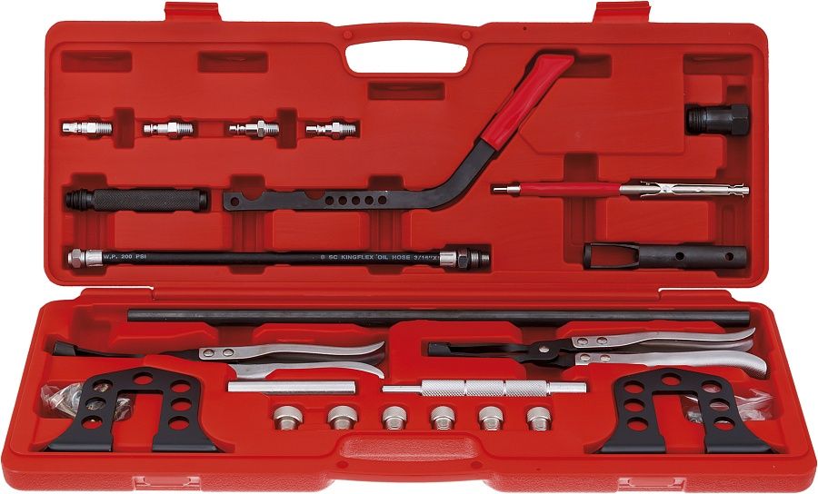 Набор включает в себя всё необходимое для снятия стопорных сухарей клапанов, а так же для снятия и установки клапанных пружин, а так же для снятия и установки маслоотражающих колпачков. Подходит для ГБЦ двигателей системы OHV, OHC, SOHC и DOHC (twincam).