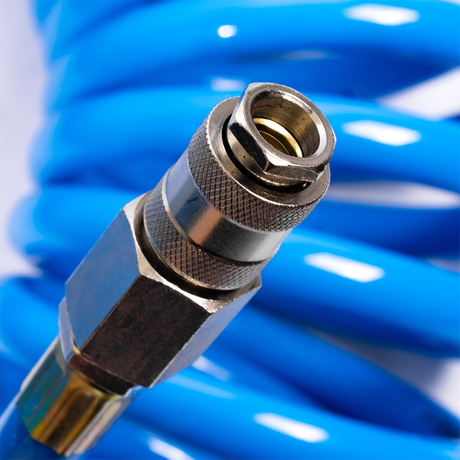 Шланг воздушный спиральный применяется для подачи воздуха от компрессора или линии сжатого воздуха к пневмоинструменту. За счет своей формы в виде спирали, шланг имеет достаточно компактный размер и не мешается под ногами.