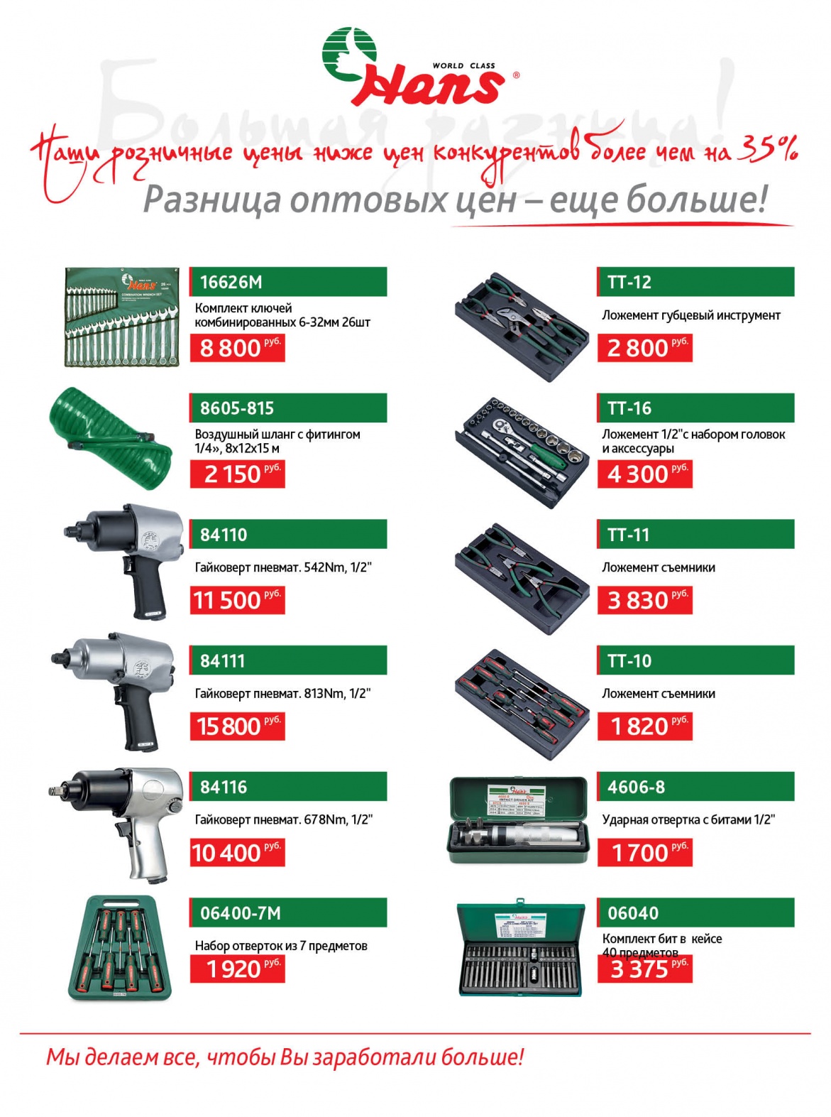 Мониторинг цен на топовые позиции инструмента Hans показал, что наши цены на порядок ниже цен конкурентов. Кроме того, часть товара не имеет аналогов на рынке инструмента.