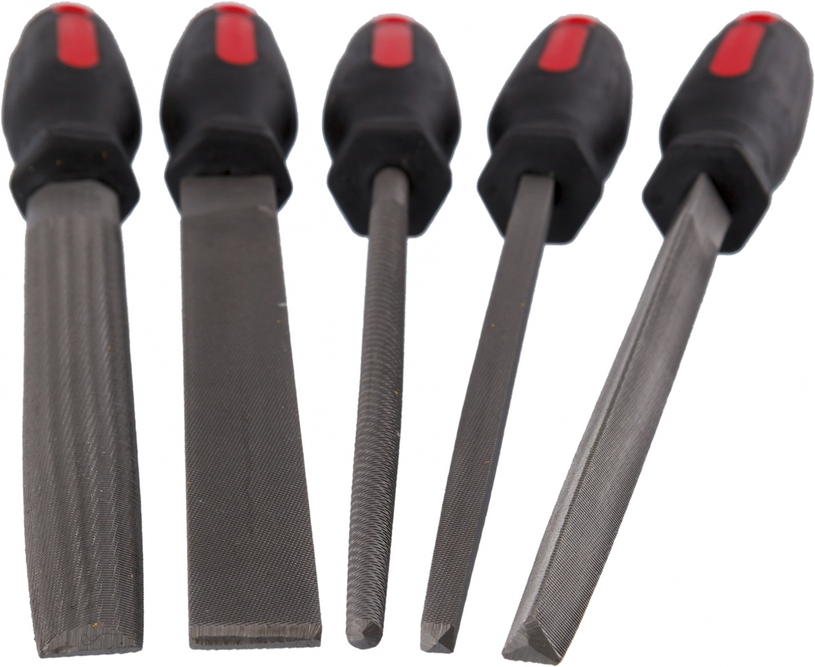 В комплект входят пять напильников: квадратный, полукруглый, плоский, круглый и трехгранный.