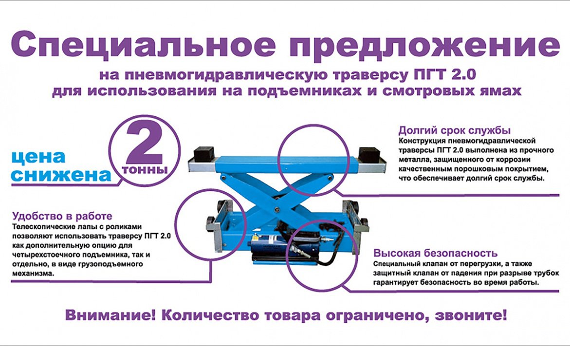 Гидравлическая траверса ПГТ-2.0 предназначена для работы с автомобильными подъемниками, легко устанавливается и имеет долгий срок службы.