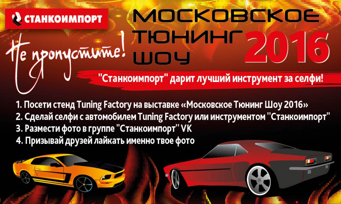 "Станкоимпорт" и Tuning Factory приглашают вас принять участие в конкурсе "ТюнингСелфи", который пройдет в рамках выставки «Московское Тюнинг Шоу 2016».