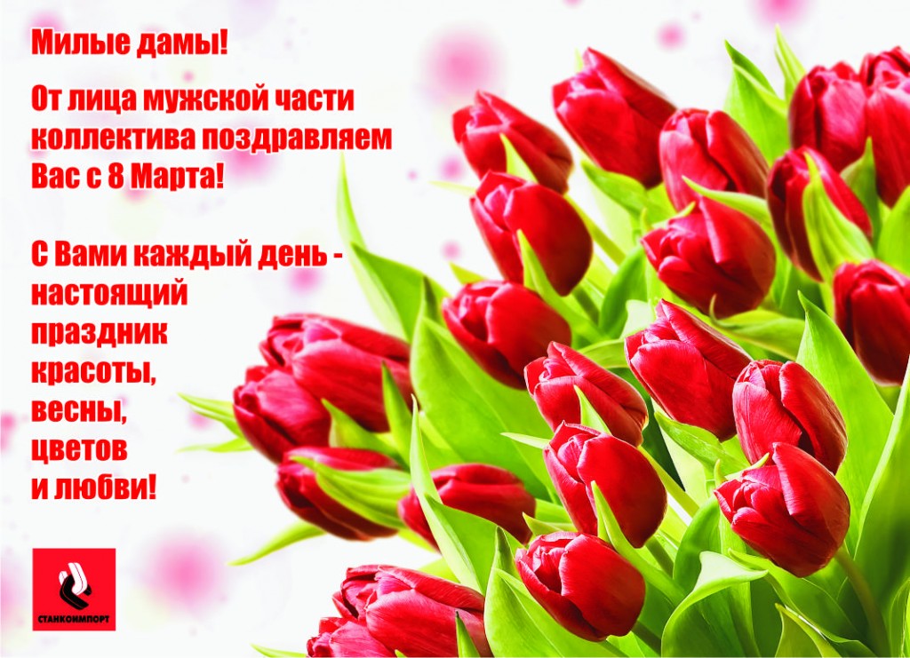 "Станкоимпорт" поздравляет с 8 марта всех женщин 07 марта 2013 СТАНКОИМПОРТ Дорогие, красивые, замечательные, необыкновенные! Спасибо за то, что вы есть и радуете нас своей красотой! С праздником! Будьте счастливы и любимы!